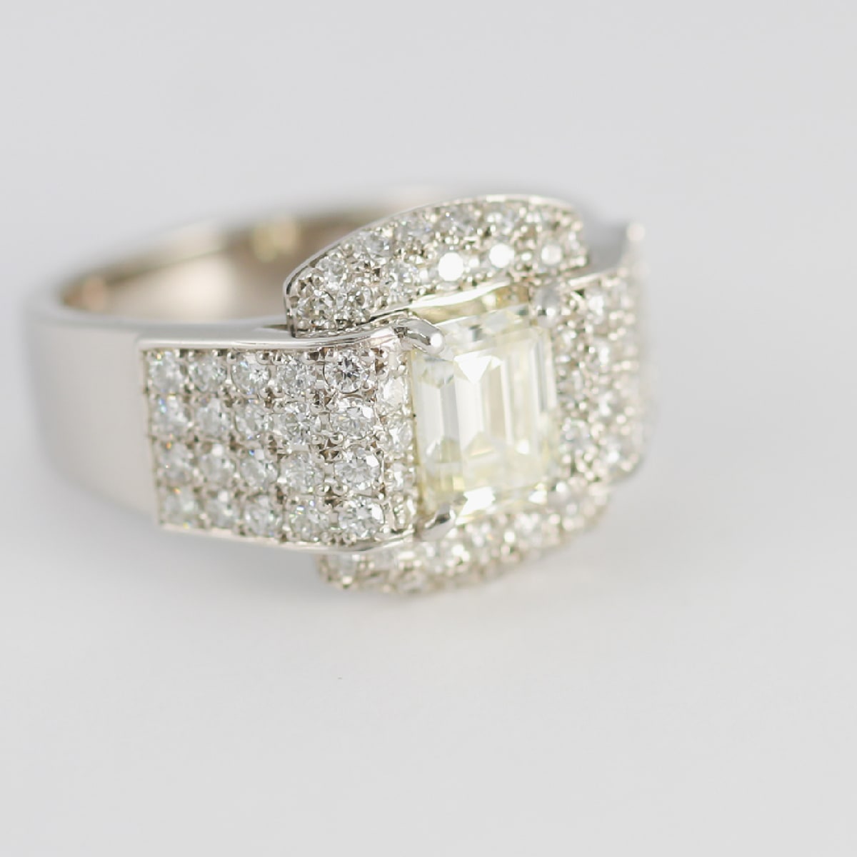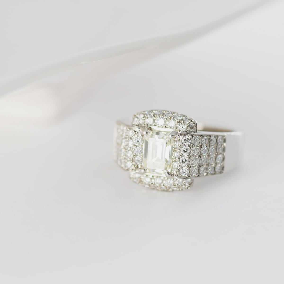 VS2クラスのエメラルドカットダイヤモンドをラージメレダイヤモンドでとり巻いたゴージャスなデザイン。