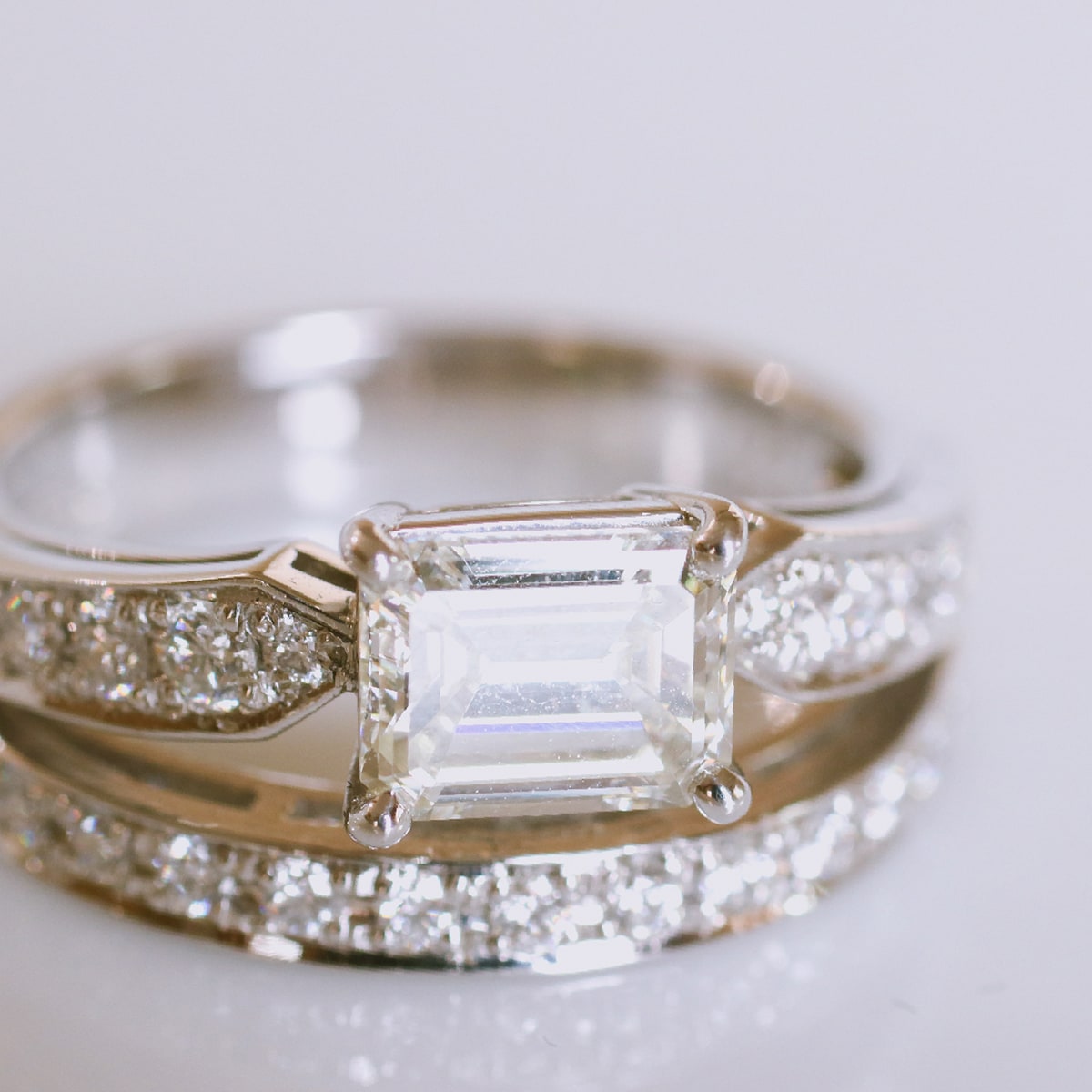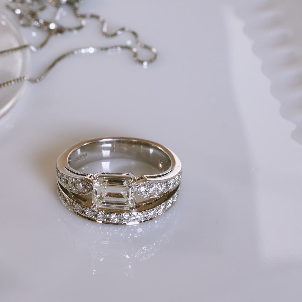 VVS2クラスのエメラルドカットダイヤモンドがゴージャスなデザイン。