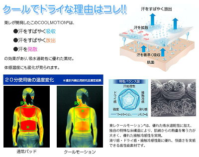 東レの「クールモーション®」素材を使用し、汗や水分を吸って素早く発散すると共に、 独自の加工によりお肌からの熱の移動量が多いので優れた接触冷感を実現。